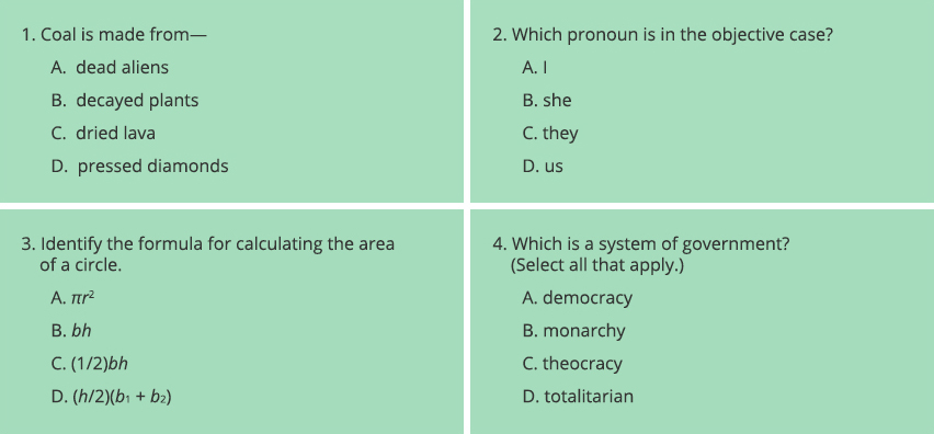 Because two answer choices include π and r and two include b and h, none stands out unnecessarily. How else are these options balanced? Two include parentheses and two do not; two include fractions and two do not; two include superscripts or subscripts and two do not; and all four include the number 2. (Most importantly, each is an actual geometric formula that students will likely have studied—under no circumstances should such an item have distractors that are not formulas!) Of course, achieving such balance takes time, but the more you practice looking for outliers, the easier it will be to spot them.