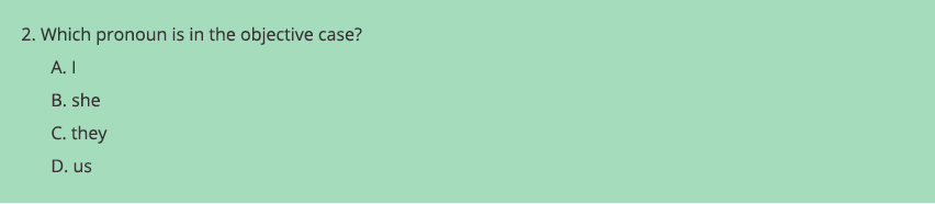 Of all the pronouns you might use for distractors, only “I” is capitalized. It thus stands out from the other three options—a problem that may be exacerbated by the language of the stem, which asks about case. (Capital “I” is an uppercase letter.) If this concern seems trivial, consider further that in many fonts (including this one), capital “I” is indistinguishable from lowercase “L”. If a student mistakes—however briefly—the vowel for the consonant, they will be distracted from the task of solving the item.