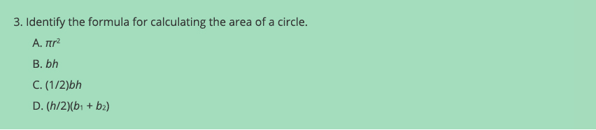 Answer choice A (πr2) is the only option that includes the symbol π. (Alternatively, it is the only option that does not include the letters b and h.) In this case, however, the outlier is the key: The formula for calculating a circle’s area is πr2. We might change the key, but then we would also have to change the stem. The easier fix is probably to change the distractors. Note that we do not have to change all three—consider this revision: