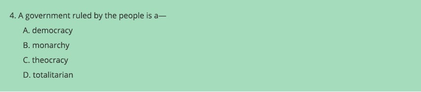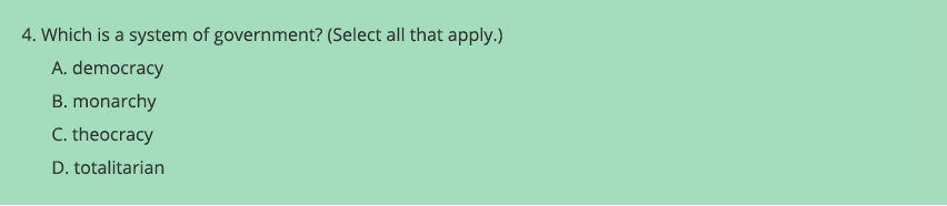 The first three options—democracy, monarchy, theocracy—are all nouns; in contrast, option D—totalitarian—is an adjective. (D is also the only option that does not end in -y, so it is dissimilar in this respect as well.) This contrast might lead students down several stray paths: They might guess D is the only correct answer, or they might guess D is not correct and select only A, B, and C. (In fact, all four answers are correct.) To fix this problem, why not change “totalitarian” to “oligarchy”?