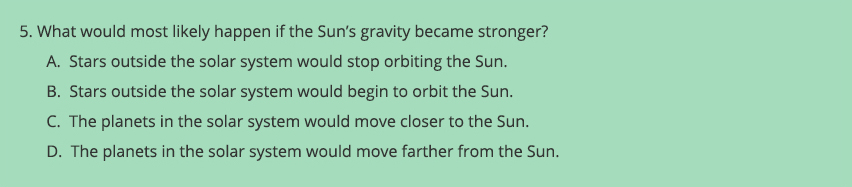 The problem is that distractor A is an impossible outlier: Stars outside the solar system cannot “stop” orbiting the Sun because they do not orbit the Sun to begin with. Savvy students who know this fact can eliminate A regardless of whether they know anything about gravity.