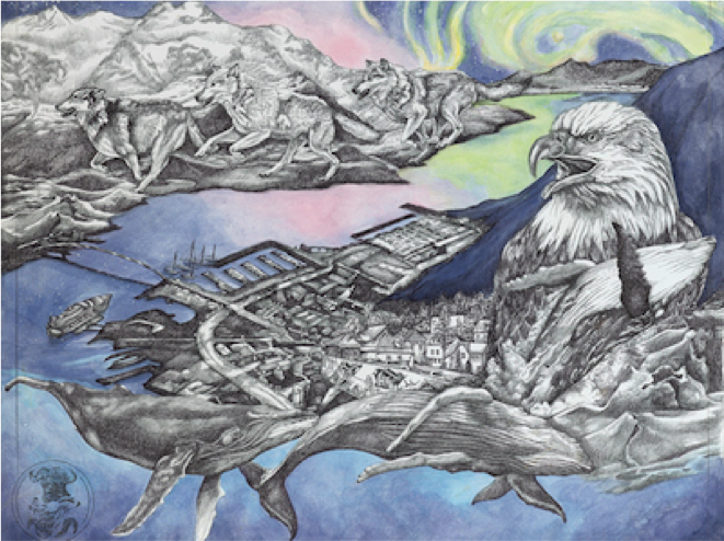 I was invited to Alaska for the first time in 2015 by friends who were launching an adventure tourism company in Juneau. I led painting tours with Adventure Flow. We’d take guests out to a remote beach where I’d help them paint their incredible surroundings. Three months turned into six months, and I was completely taken by Alaska. I ended my stay that year with an art exhibition at the Juneau Arts and Humanities Council, and a burning passion for wild land. I returned the following summer to illustrate three children’s books with Sealaska Heritage, an Alaska Native organization. I also traveled as an artist in residence with the U.S. Fish and Wildlife Service (USFWS) in the Arctic National Wildlife Refuge. We backcountry camped in the refuge and celebrated with the Gwich’in during the Alaska Natives’ biennial Gathering in Arctic Village. I drew portraits and listened to the stories of elders, and created a final artwork that described the intricate and inextricable connection between the people and the Arctic land, used by USFWS for education, inspiration and native relations. I have continued to travel and create as a resident artist with USFWS, visiting the Arctic Coast and Inupiaq village Kaktovik, and the Yukon Delta National Wildlife Refuge, the land of the Yup’ik Eskimos. This summer, I’ll return to document the Yukon Flats National Wildlife Refuge and exhibit my art at the Canvas [an inclusive arts community] in Juneau. I have been completely humbled by my experiences in Alaska—the wild land, the generosity of the people. Its influence permeates everything I create.