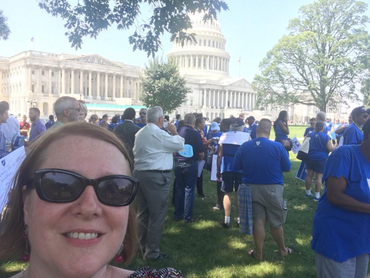 It was hot. Really hot. I didn’t want to leave for the #KidsNotCuts rally any sooner than necessary. I’d already slathered on the sunscreen—thankfully provided by the AFT. The next obstacle to getting to the rally was the bus ride from the conference to Capitol Hill. I don’t know about you, but I find it a bit daunting to get on a bus without my “bus buddy” all lined up. I was determined to participate, even if I was nervous. I boarded the bus and asked the woman sitting in the very front seat, “Is anyone sitting here?” Luckily, she and I hit it off right away. We chatted about her daughter, who had attended college near me, and she asked if I was a crazed Buffalo sports fan, which we are quite known for. She put me at ease, only telling me that she “worked for AFT.”