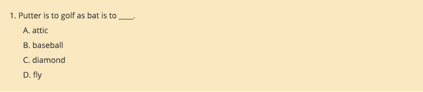 Unless students have currently been studying sports and sports equipment, a correct answer depends on a student’s background. If students come from middle- to upper-class families, they may be familiar with the game of golf and how a putter is used in that game. On the other hand, students with a lower socioeconomic status may not have the same advantage. Furthermore, the word bat has more than one meaning, making the question more difficult without a full understanding of the first relationship. An unbiased question would rely on information a student has learned through schoolwork, and does not draw on what a student may or may not have learned at home. Examples of socioeconomic bias may be seen commonly in items related to careers, purchases, home-ownership, and recreational activities.