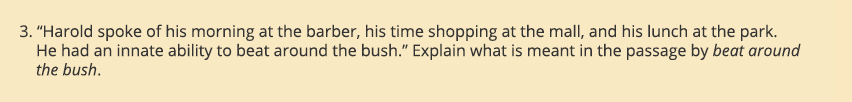 Idioms, such as the phrase beat around the bush, can be great to include in assessment items that test whether students can derive meaning of an unfamiliar word or phrase from the surrounding text. However, in this item, there are no clear context clues within the question text that reveal the meaning of the phrase. The answer may or may not be known to students based on their own experience. Idioms may be regional, or they may be unfamiliar to immigrants or ESL students. Test items that include references to cultural details that may be unfamiliar to specific student groups may be considered biased.