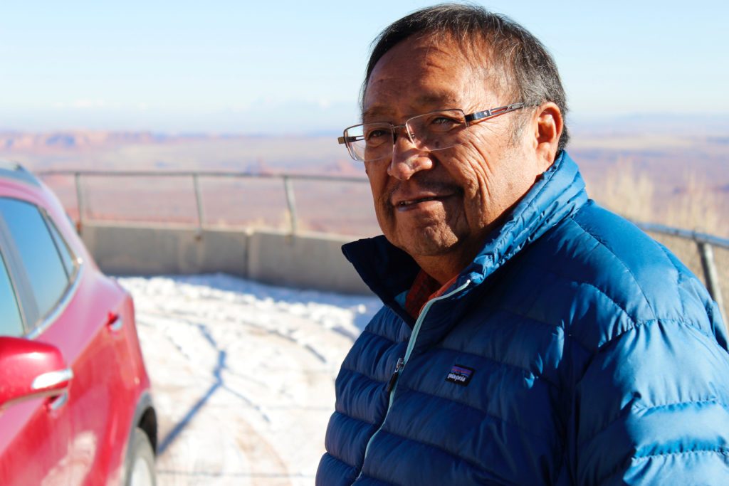 Jonah Yellowman talks with visitors on a highway pullout near the Bears Ears formations where he and fellow Navajos go to gather wood to heat their homes and pray to spirits of their ancestors in Utah, U.S. December 19, 2016. Picture taken December 19, 2016. REUTERS/Annie Knox